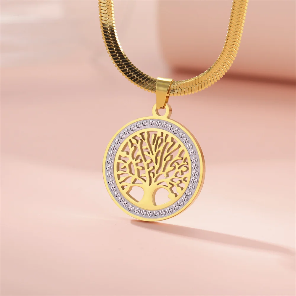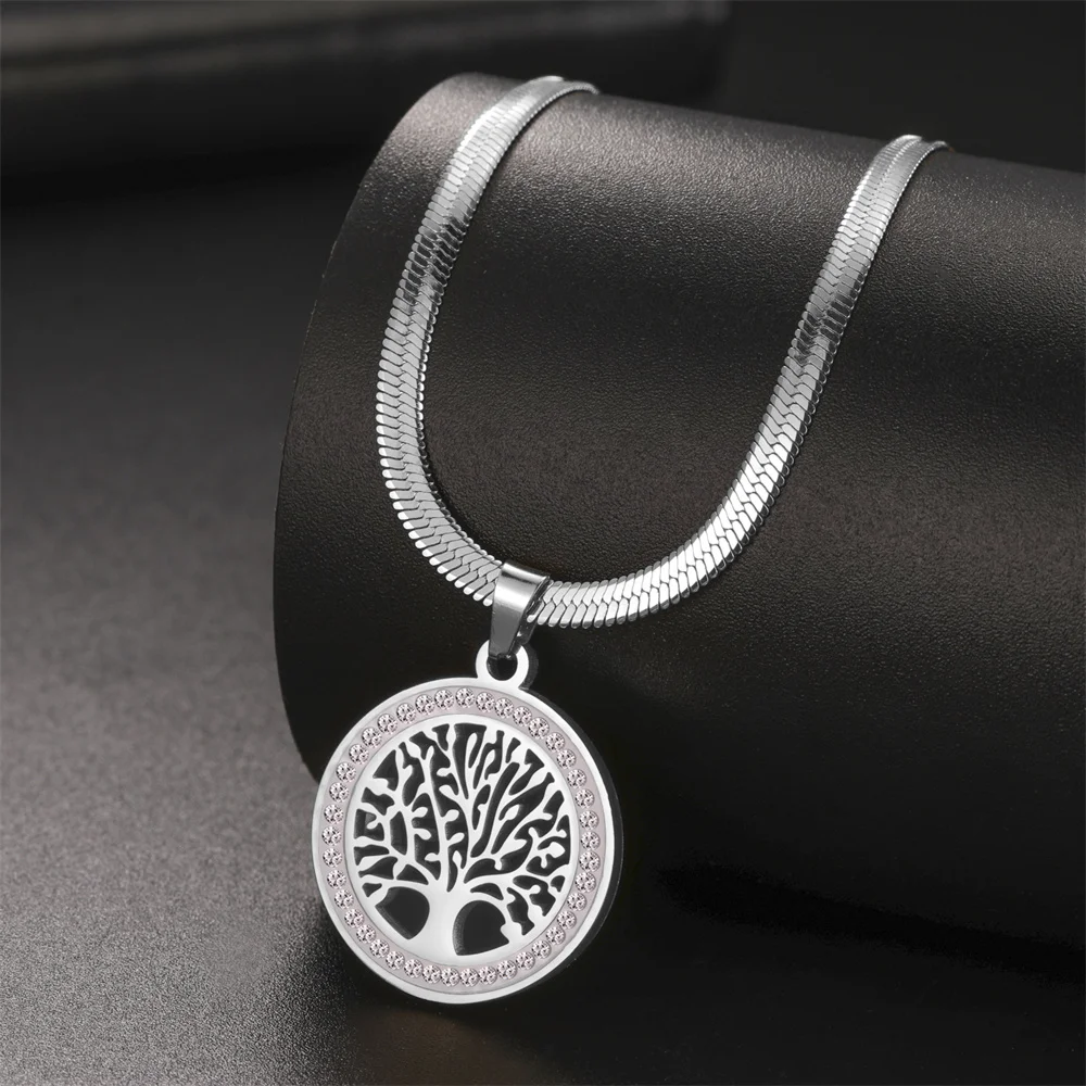 Tree of Life Rhinestone Necklace, Stainless Steel Round Pendant with Chain for Jewelry Gift.